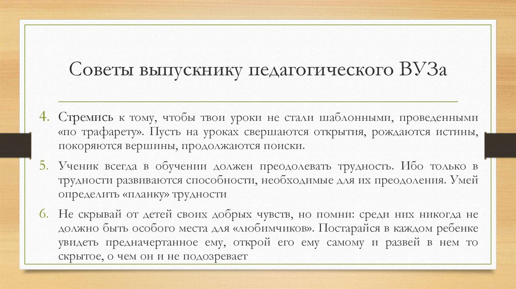 Советы выпускнику педагогического ВУЗа4. Стремись к тому, чтобы твои уроки не стали шаблонными, проведенными