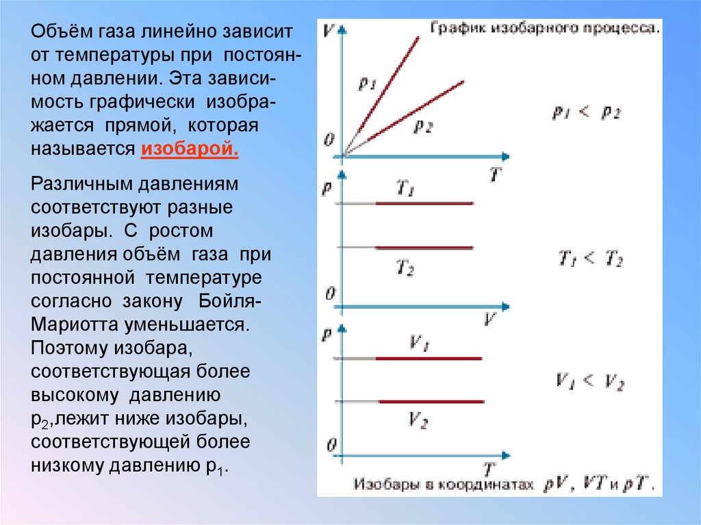 Объём газа линейно зависитот температуры при постоянном давлении. Эта зависимость графически изображается прямой, которая