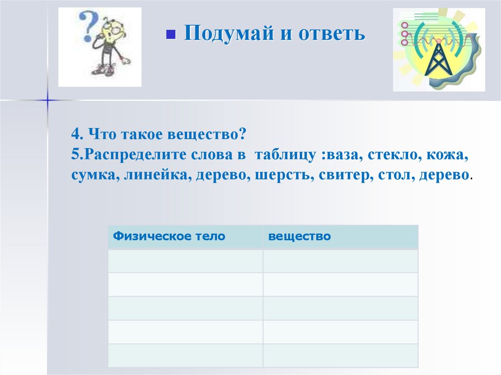 4.Распределите слова в таблицу :ваза, стекло, кожа,