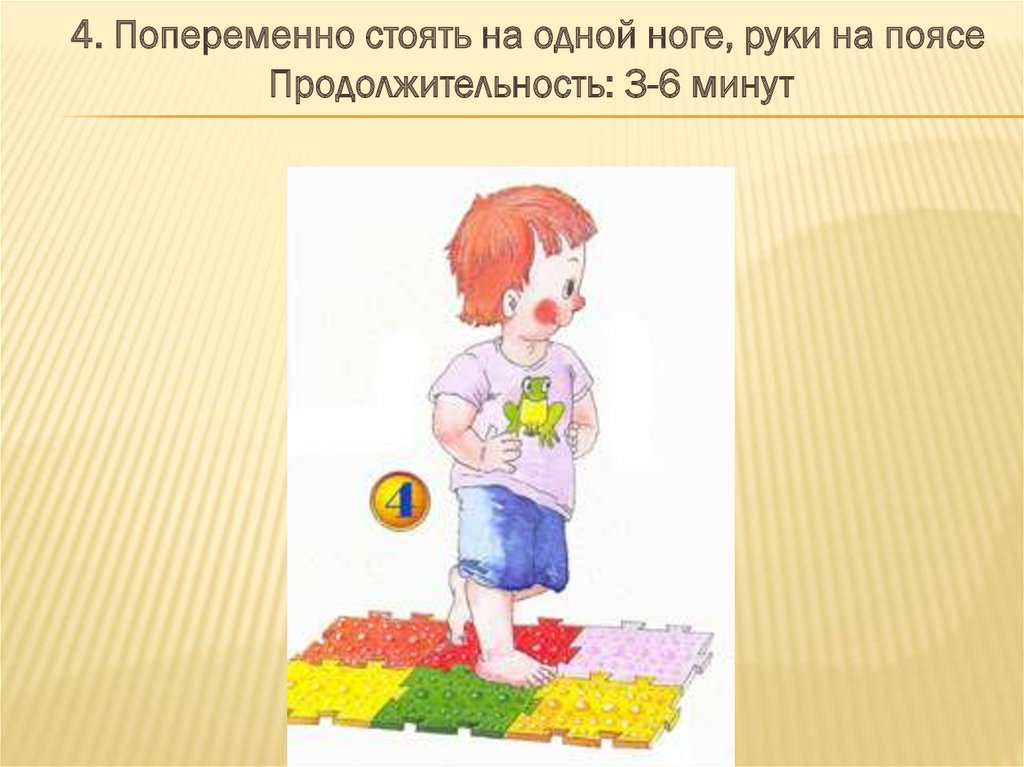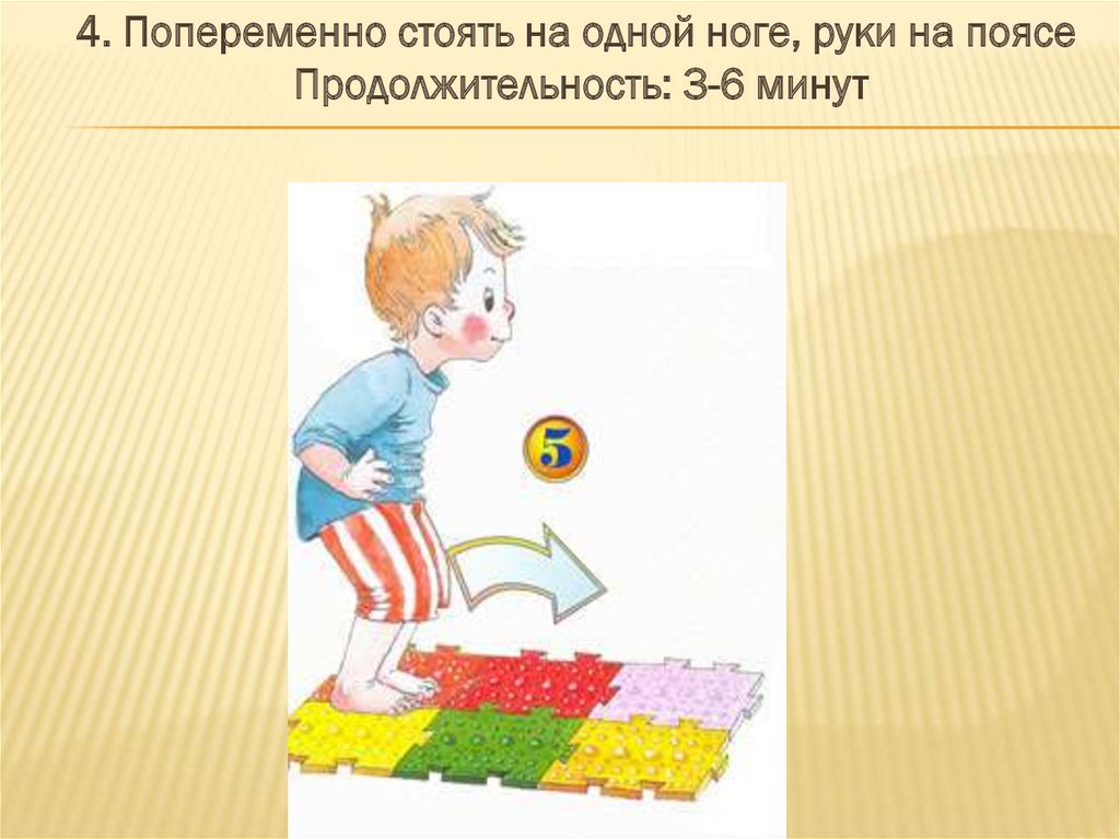 4. Попеременно стоять на одной ноге, руки на поясеПродолжительность: 3-6 минут