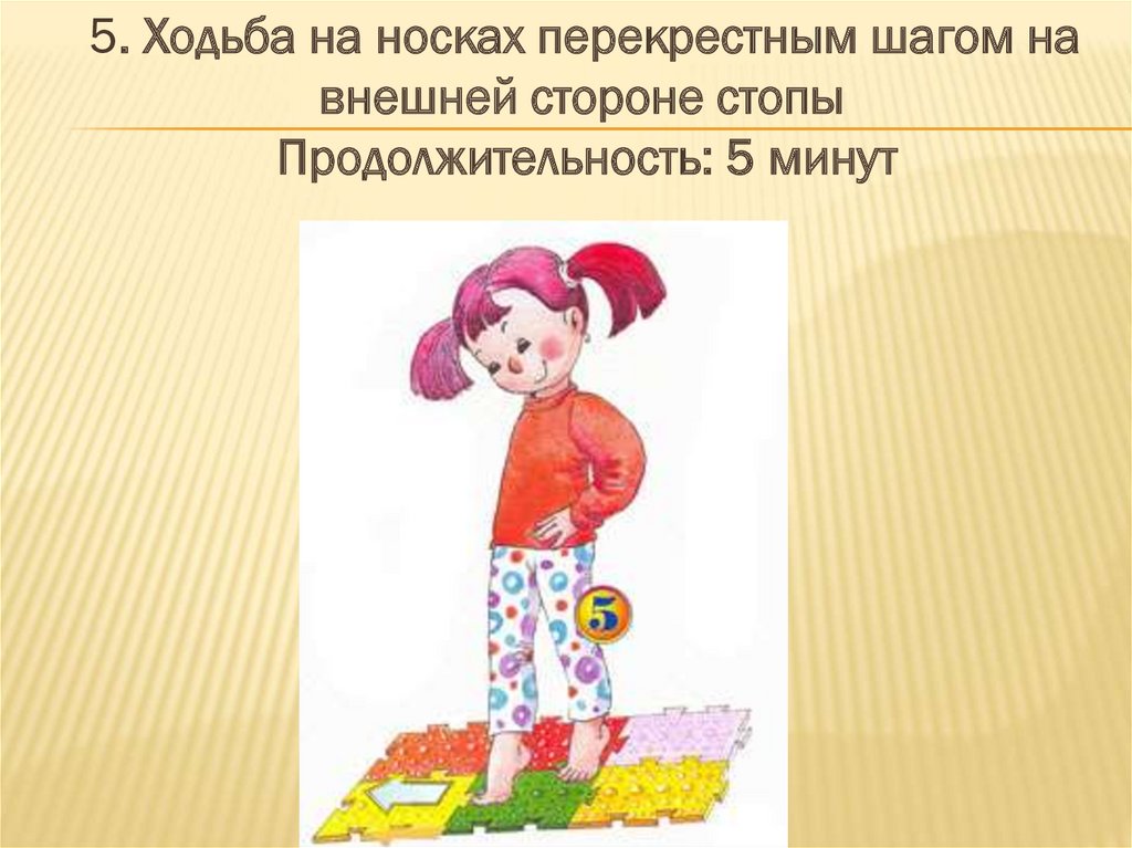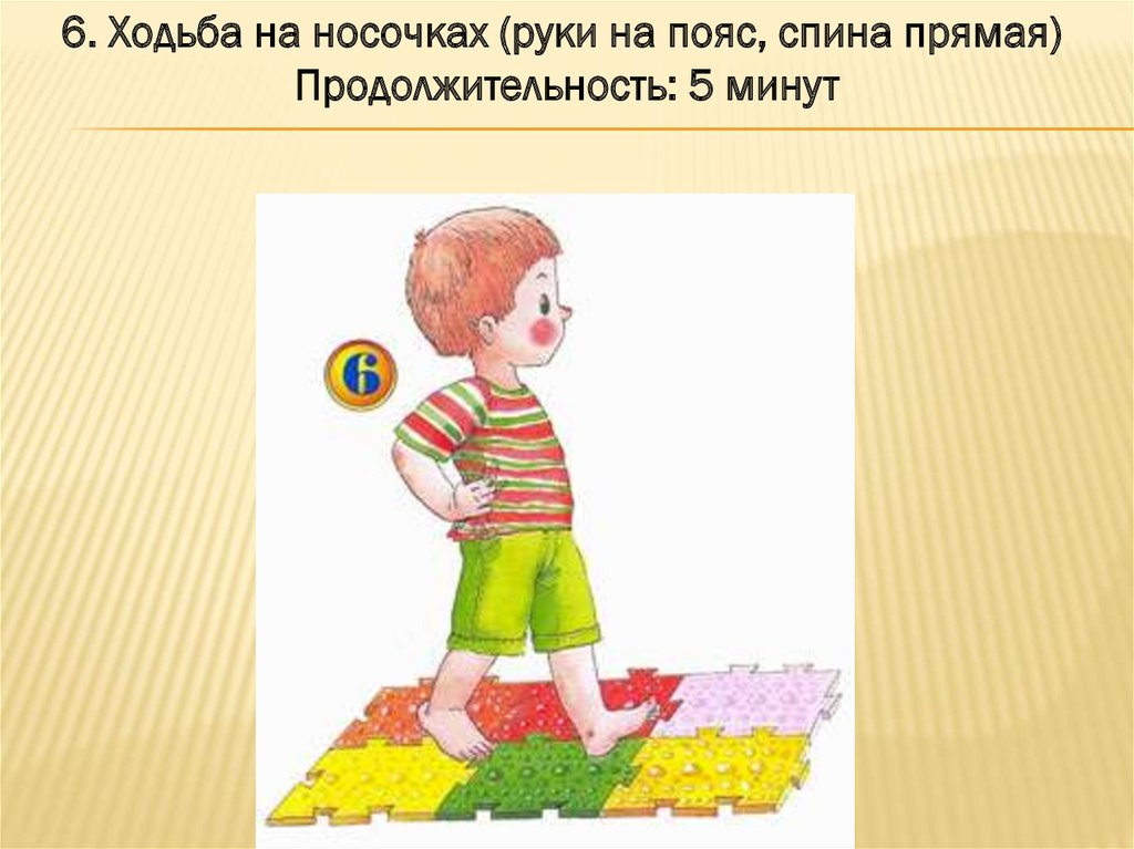 6. Ходьба на носочках (руки на пояс, спина прямая)Продолжительность: 5 минут
