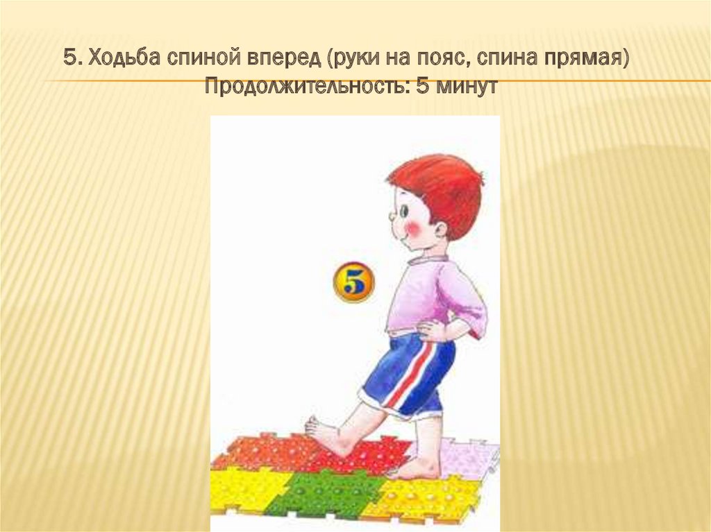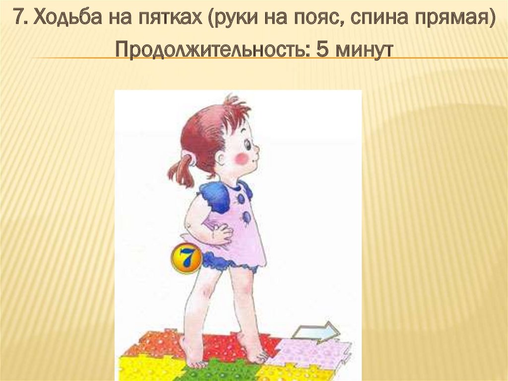 7. Ходьба на пятках (руки на пояс, спина прямая)Продолжительность: 5 минут