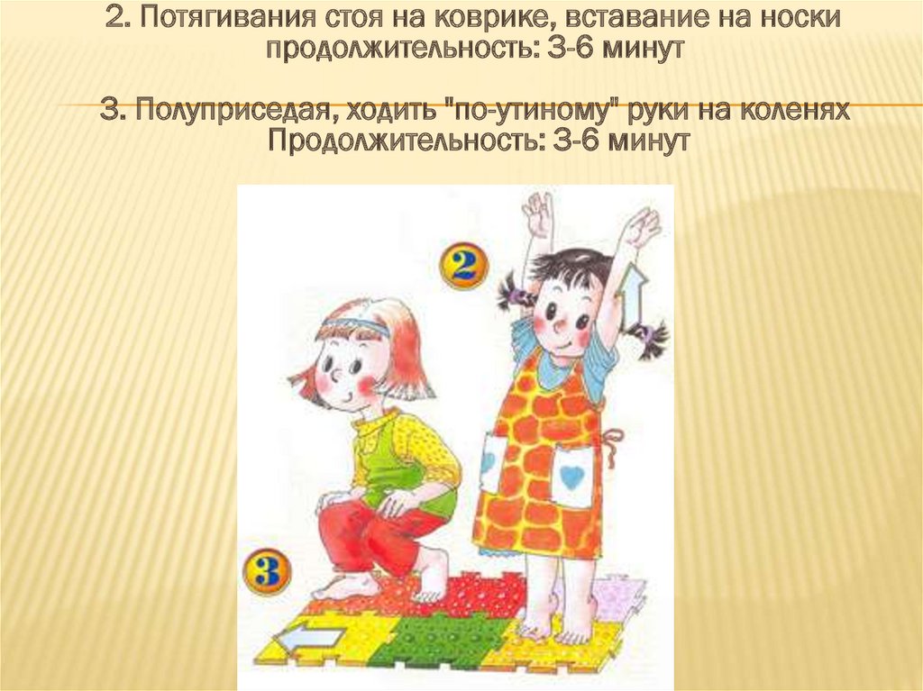 2. Потягивания стоя на коврике, вставание на носкипродолжительность: 3-6 минут