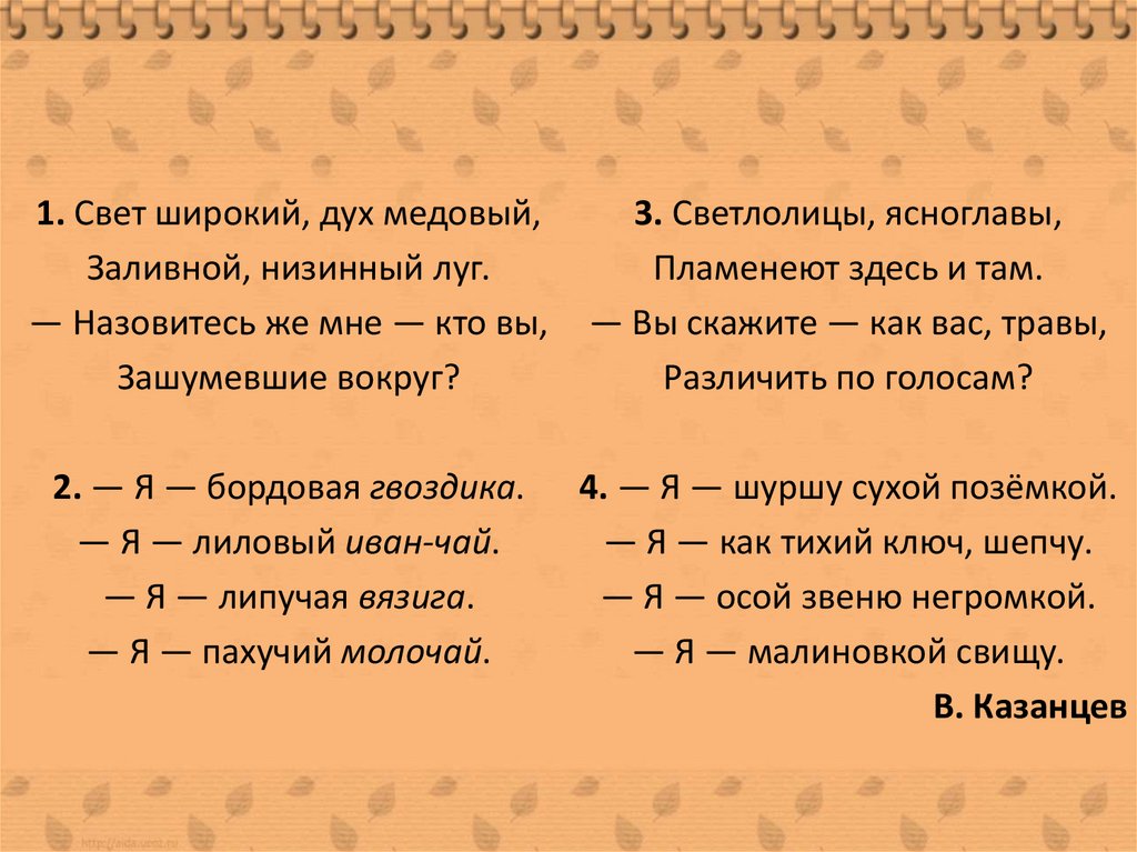 1. Свет широкий, дух медовый,Заливной, низинный луг.