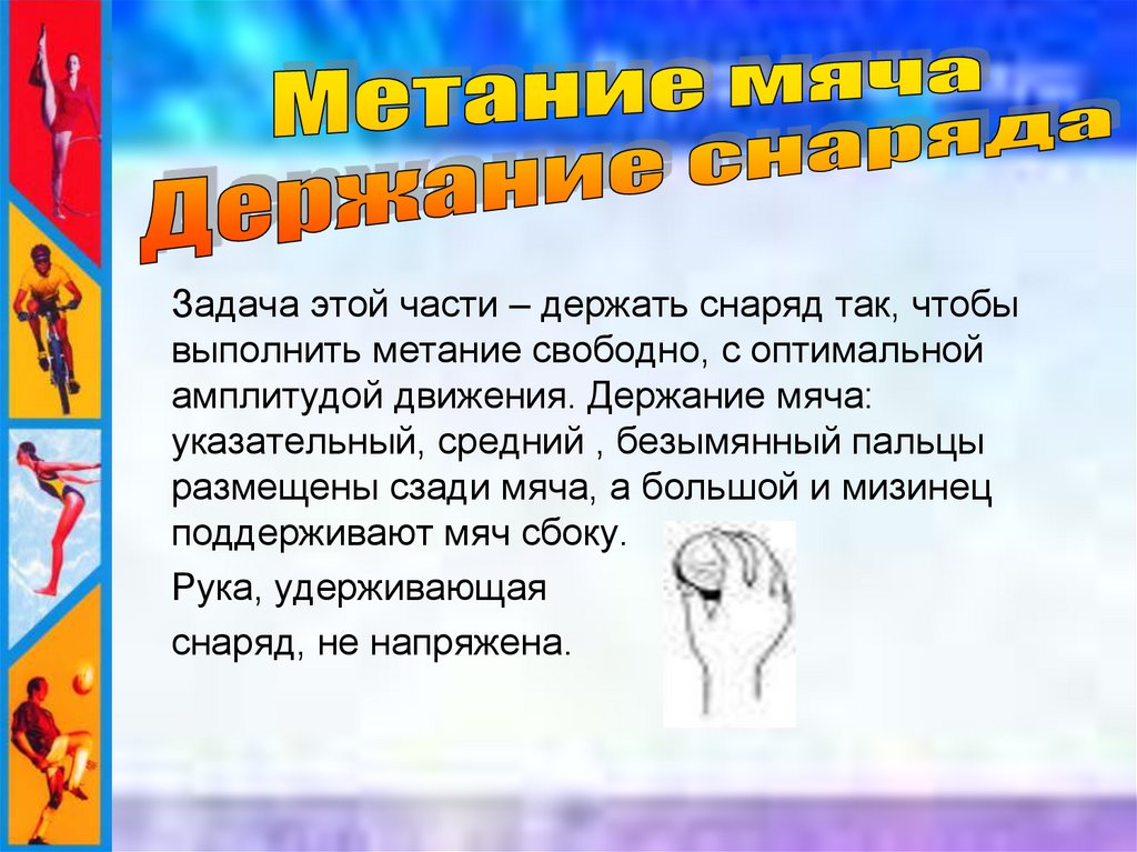 Задача этой части – держать снаряд так, чтобывыполнить метание свободно, с оптимальной