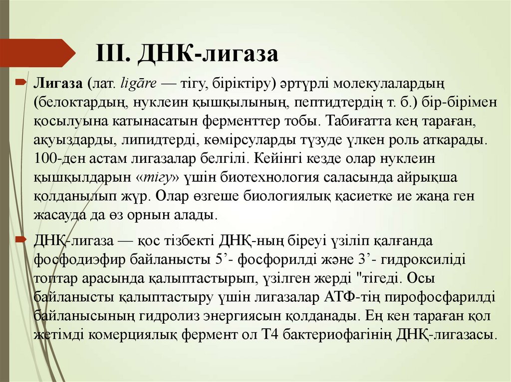 ІІІ. ДНК-лигазаЛигаза (лат. ligāre — тігу, біріктіру) әртүрлі молекулалардың