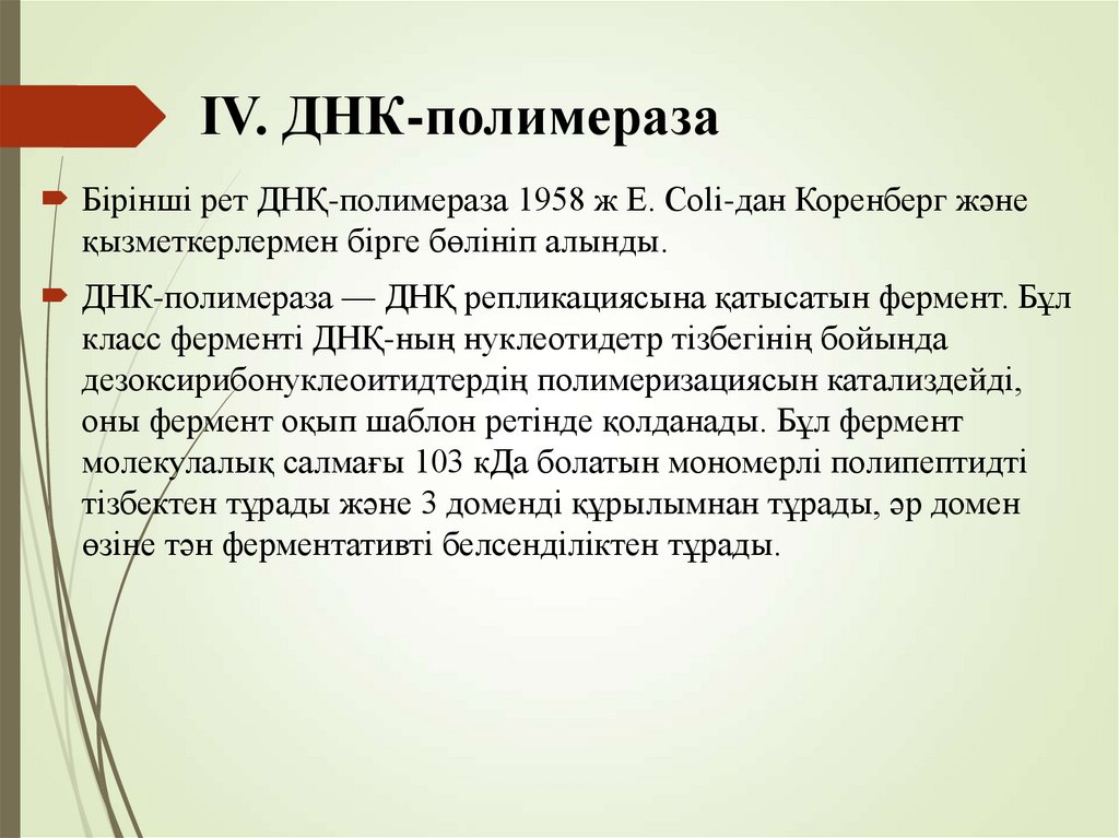 ІV. ДНК-полимеразаБірінші рет ДНҚ-полимераза 1958 ж E. Coli-дан Коренберг және