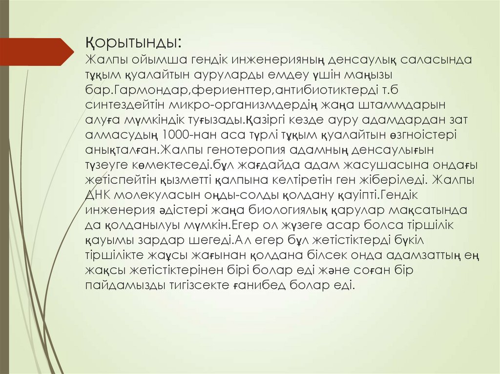 Қорытынды:Жалпы ойымша гендік инженерияның денсаулық саласында