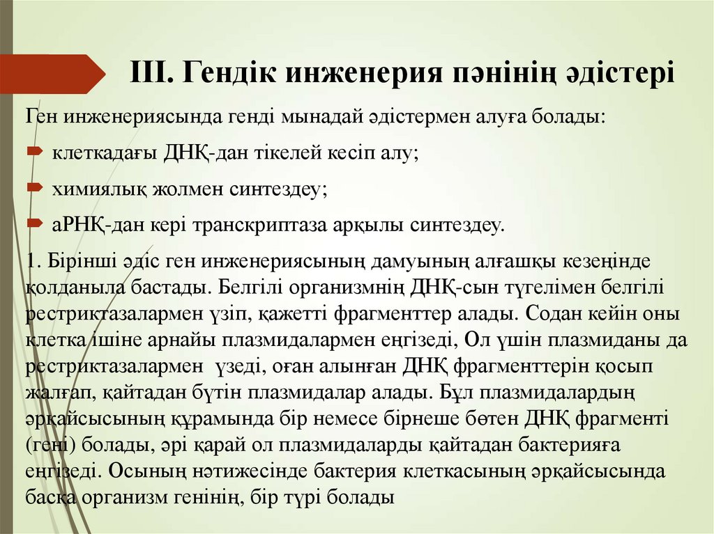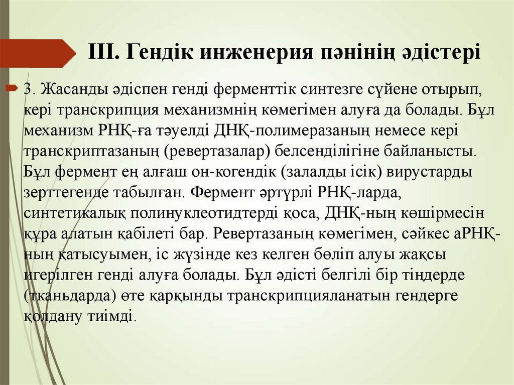 ІІІ. Гендік инженерия пәнінің әдістері3. Жасанды әдіспен генді ферменттік синтезге сүйене отырып,