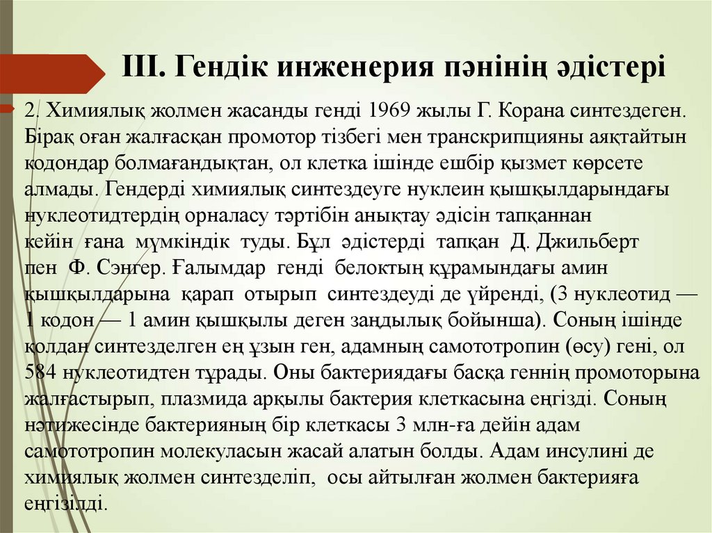 ІІІ. Гендік инженерия пәнінің әдістері2. Химиялық жолмен жасанды генді 1969 жылы Г. Корана синтездеген.