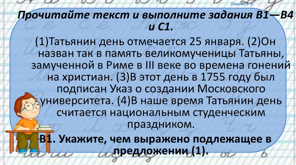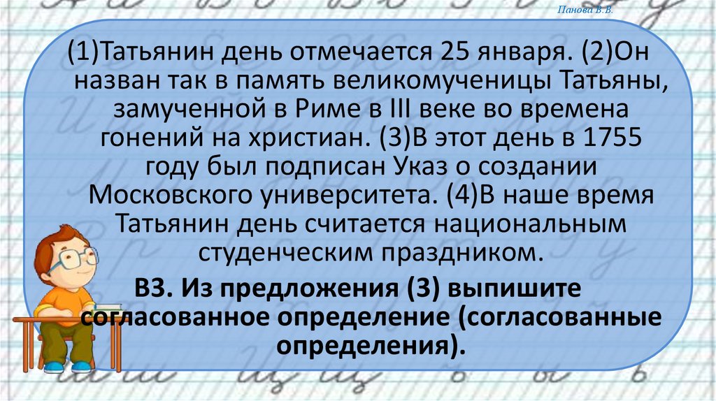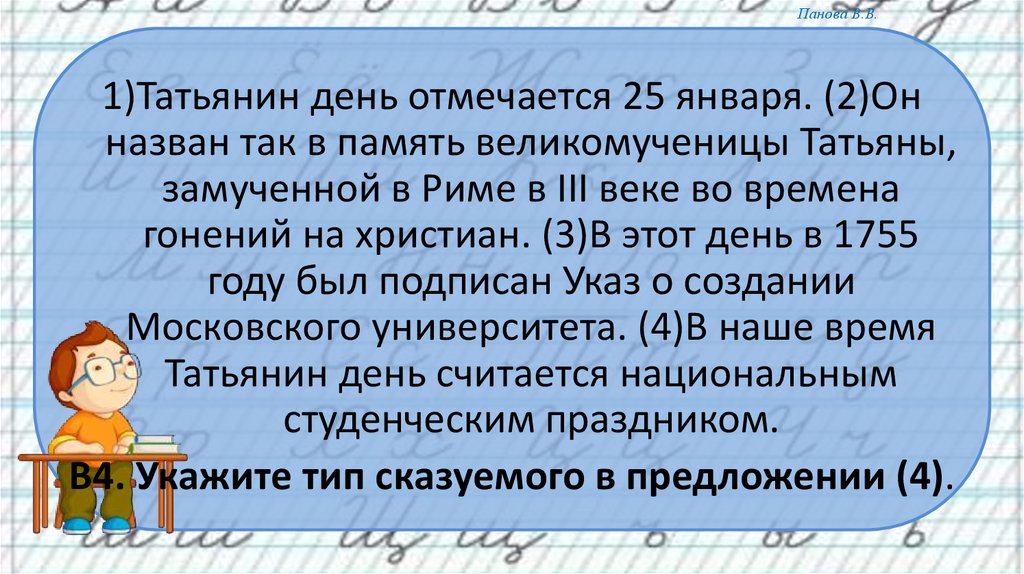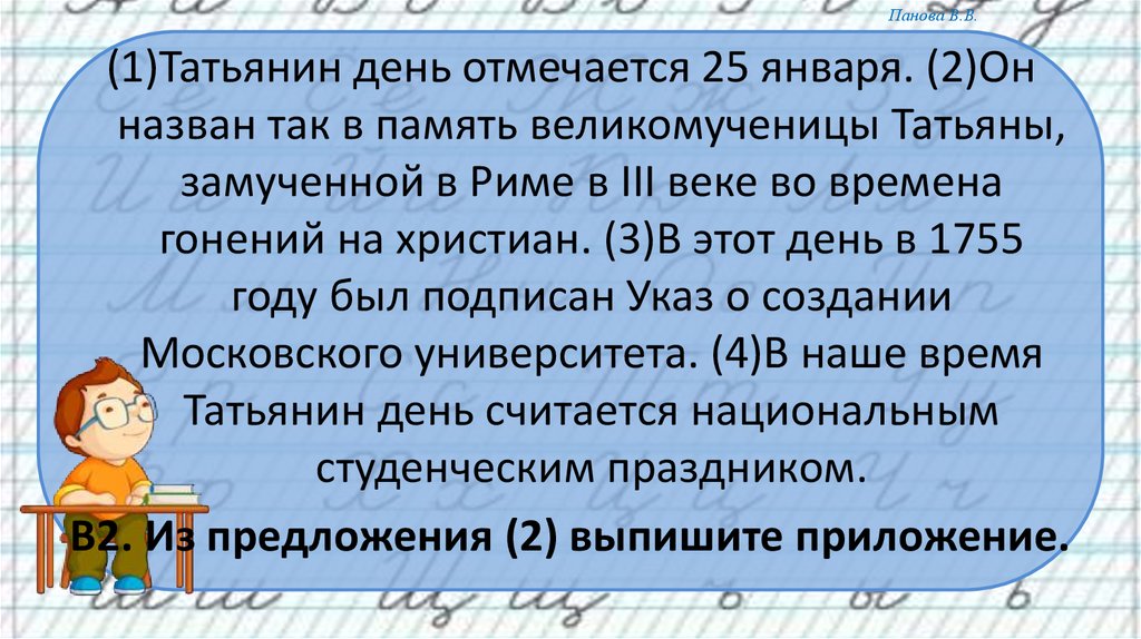 Панова В.В.(1)Татьянин день отмечается 25 января. (2)Он