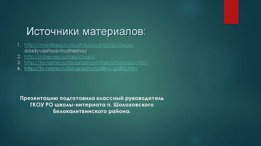 Источники материалов:1. http://manliness.ru/muzhskaya-zhizn/iz-chegoskladyvaetsya-muzhestvo/