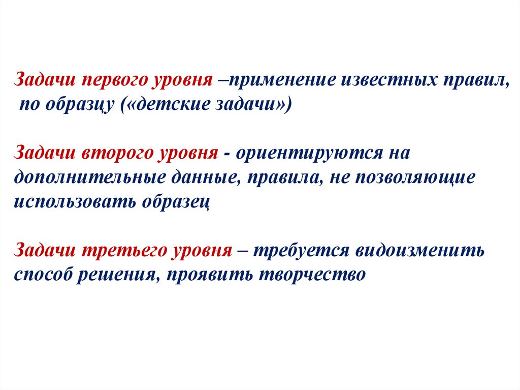 Задачи первого уровня –применение известных правил,по образцу («детские задачи»)