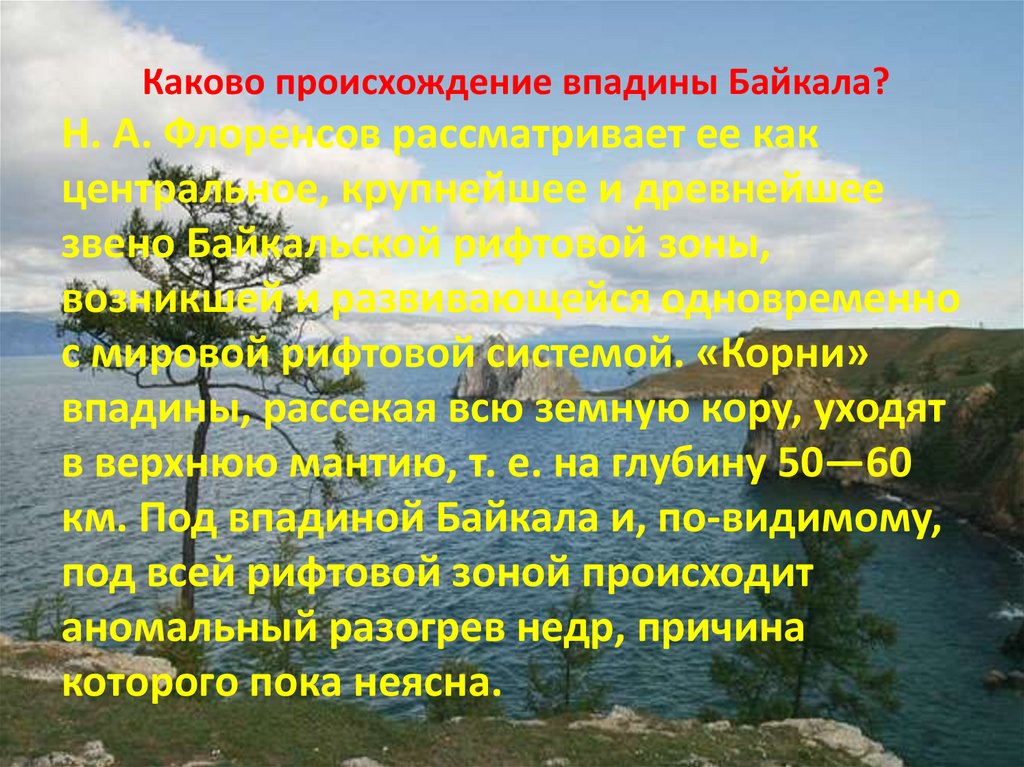 Каково происхождение впадины Байкала?Н. А. Флоренсов рассматривает ее как