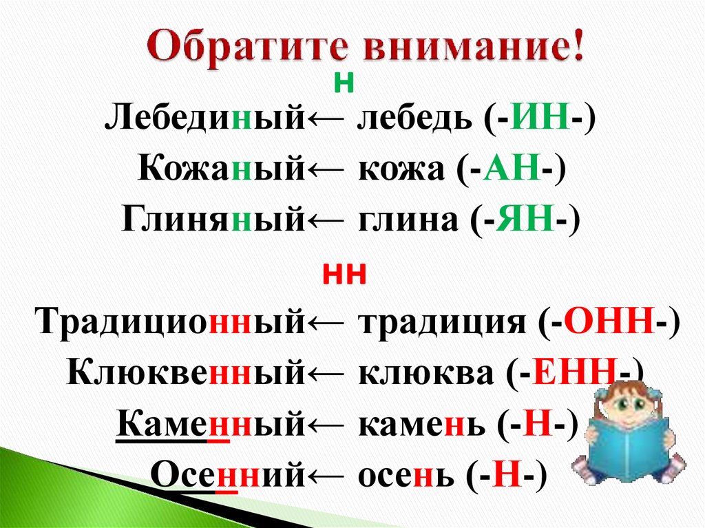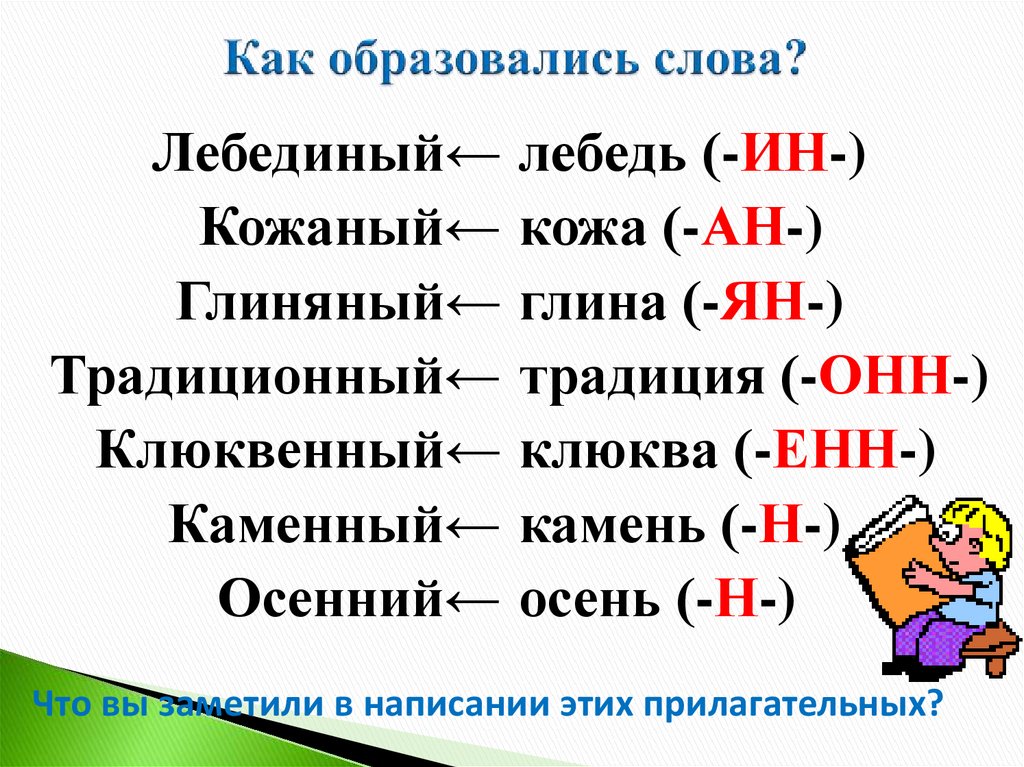 Лебединый← лебедь (-ИН-)Кожаный← кожа (-АН-)