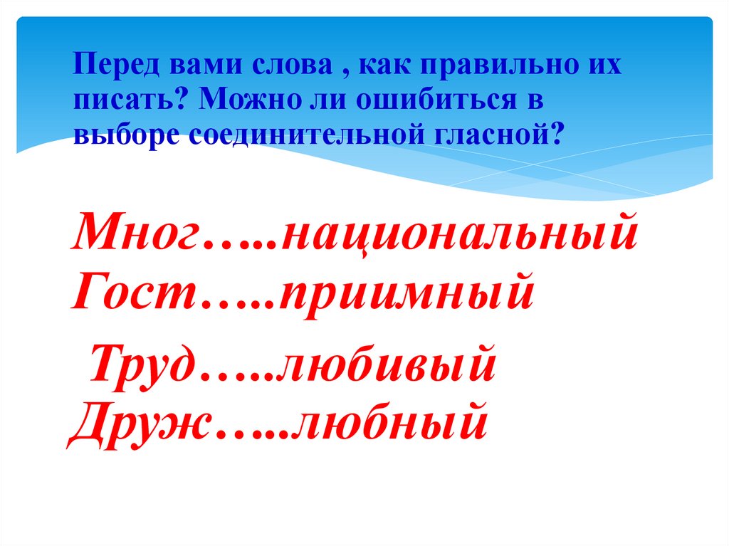 Знать: сложные слова образуютсяот основ исходных слов с помощью
