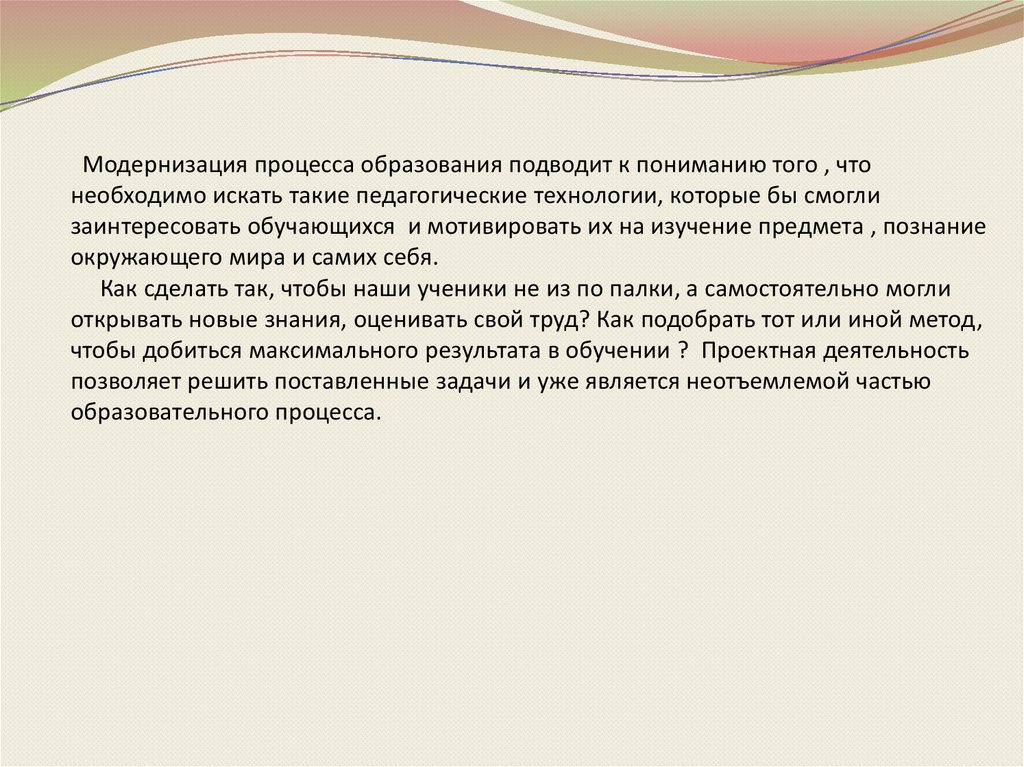 Модернизация процесса образования подводит к пониманию того , чтонеобходимо искать такие педагогические технологии, которые бы смогли