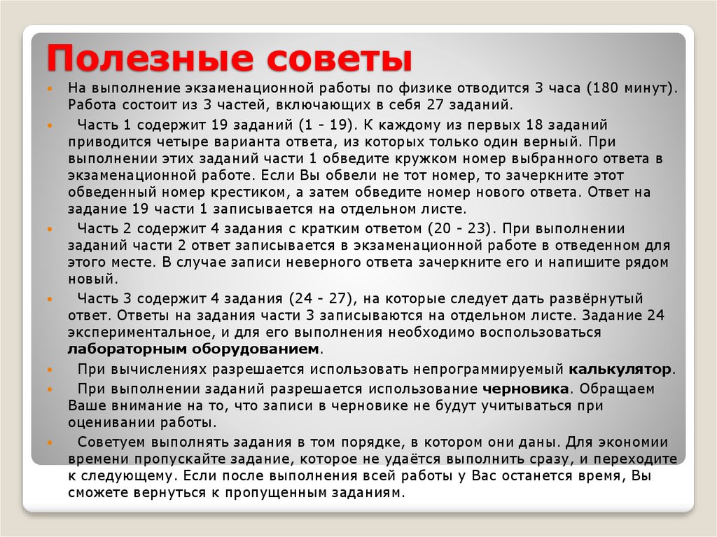 Полезные советыНа выполнение экзаменационной работы по физике отводится 3 часа (180 минут).