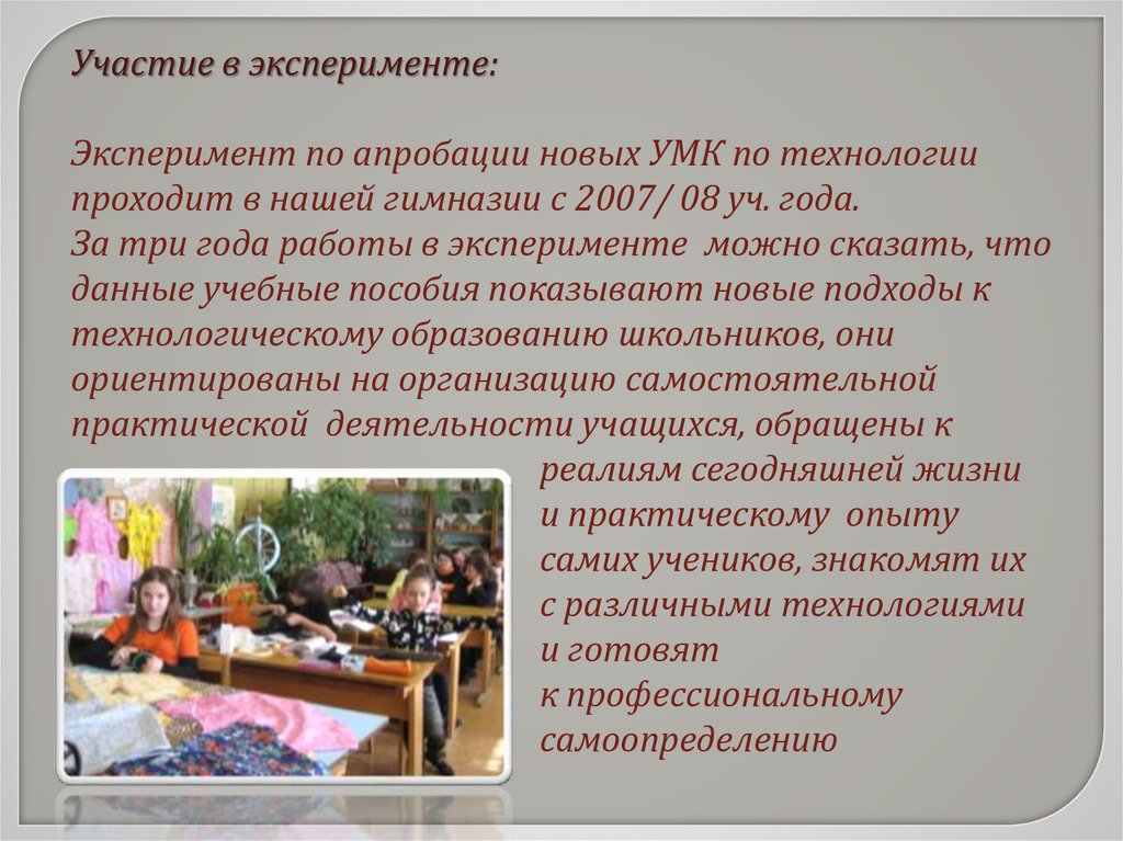 Участие в эксперименте:Эксперимент по апробации новых УМК по технологии