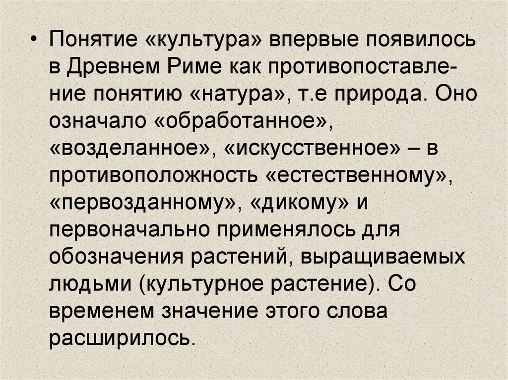• Понятие «культура» впервые появилосьв Древнем Риме как противопоставление понятию «натура», т.е природа. Оно
