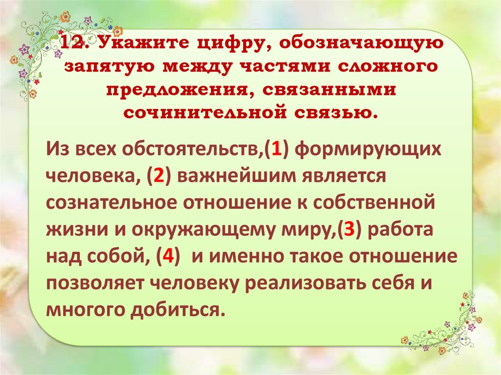 12. Укажите цифру, обозначающуюзапятую между частями сложного