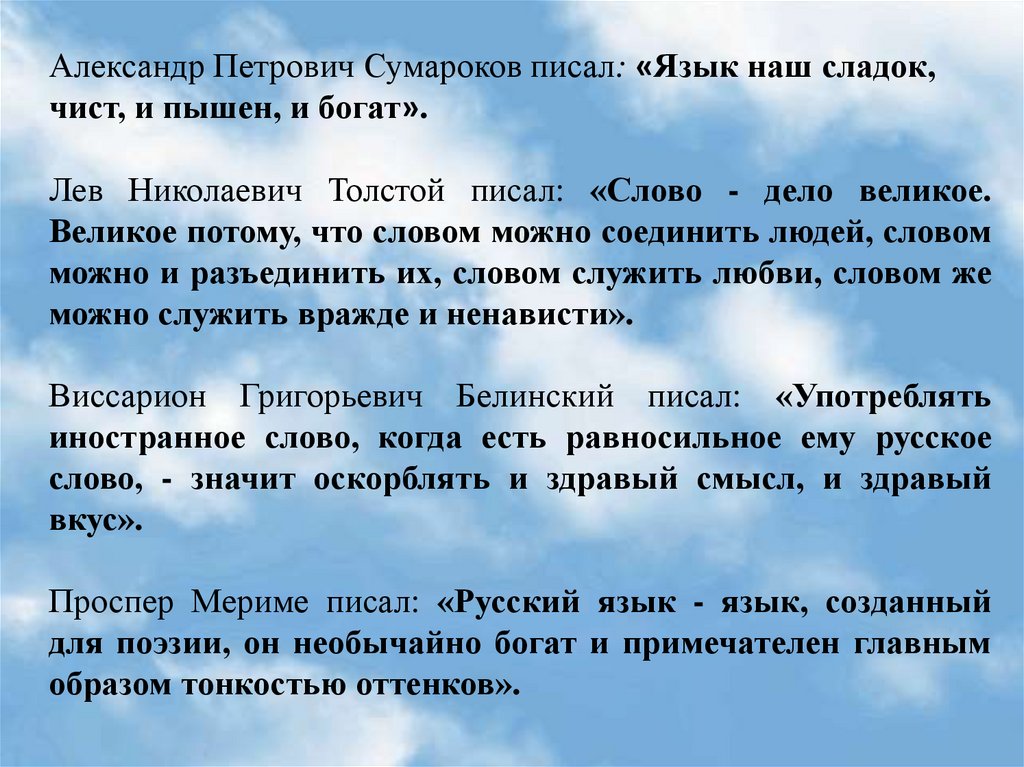 Александр Петрович Сумароков писал: «Язык наш сладок,чист, и пышен, и богат».