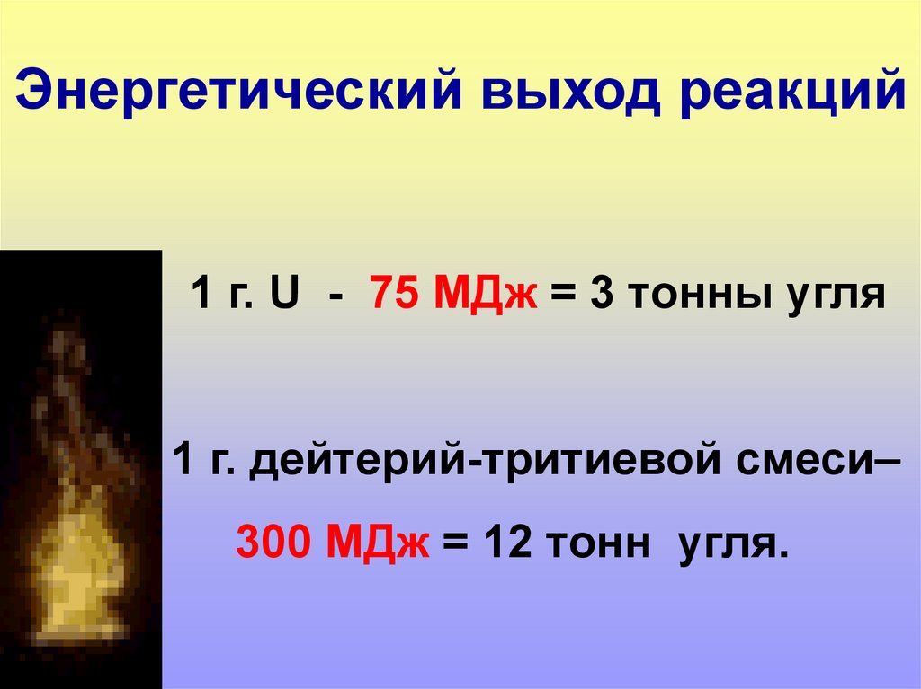Энергетический выход реакций1 г. U - 75 МДж = 3 тонны угля