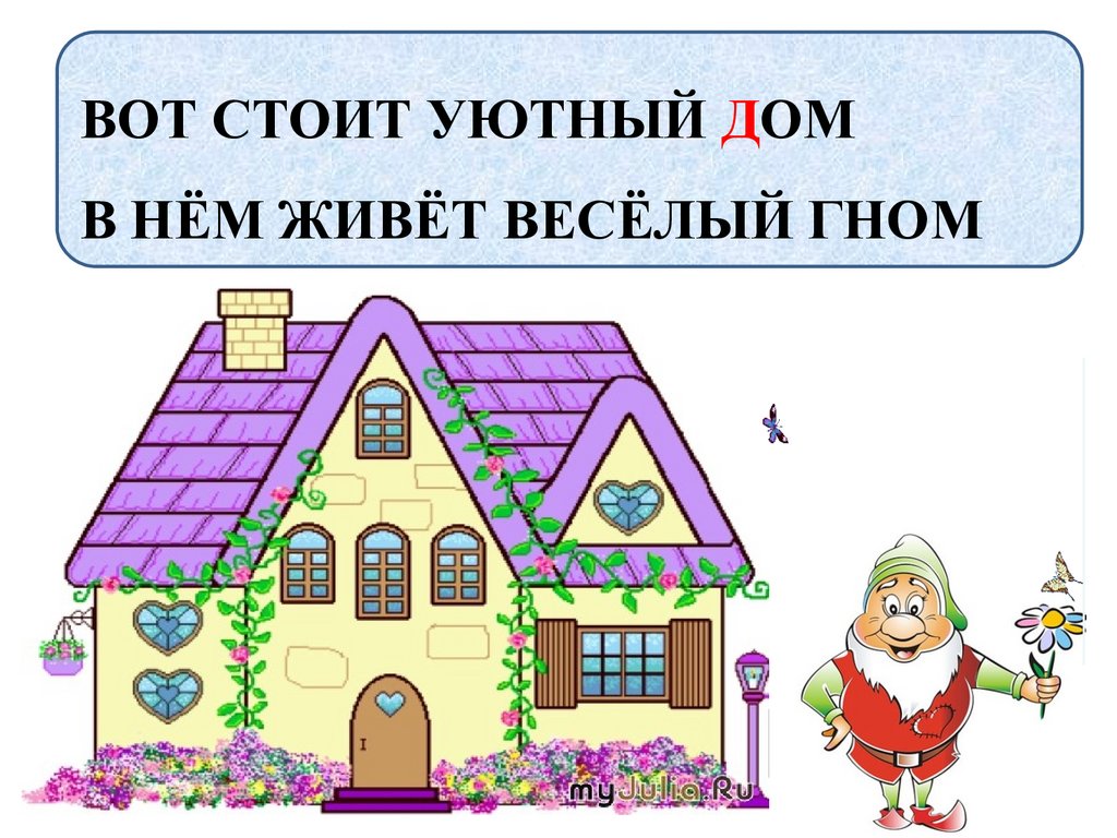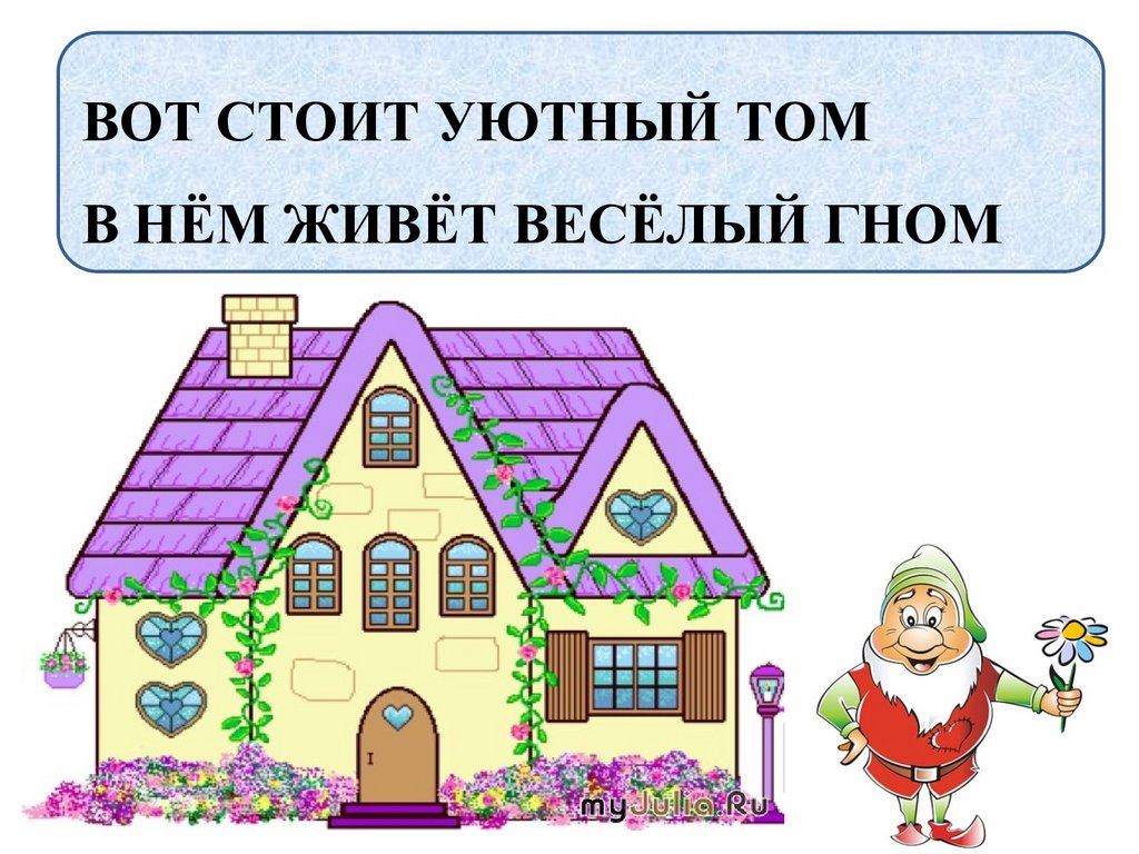 ВОТ СТОИТ УЮТНЫЙ ДОМВ НЁМ ЖИВЁТ ВЕСЁЛЫЙ ГНОМ
