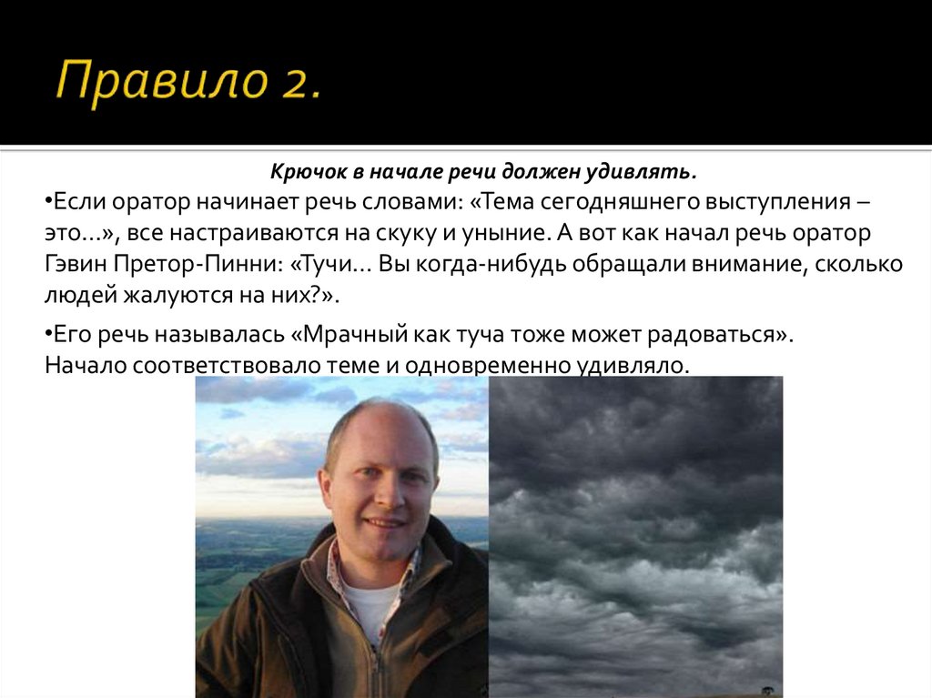 Крючок в начале речи должен удивлять.•Если оратор начинает речь словами: «Тема сегодняшнего выступления –