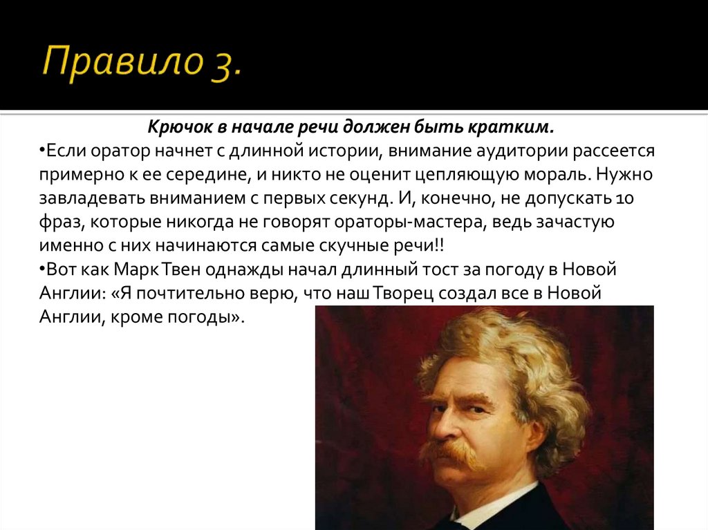 Крючок в начале речи должен быть кратким.•Если оратор начнет с длинной истории, внимание аудитории рассеется
