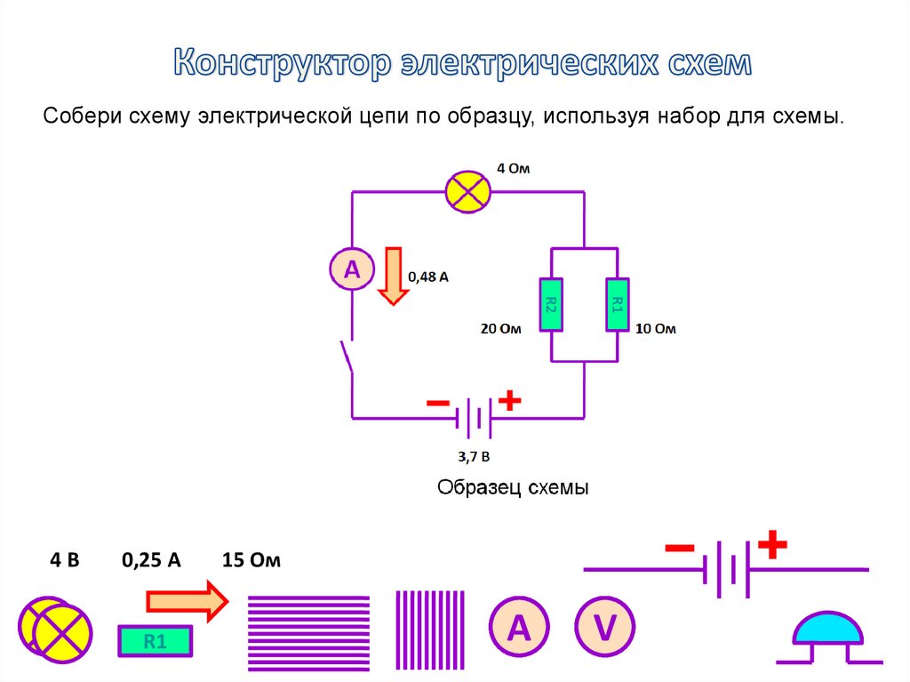 Собери схему электрической цепи по образцу, используя набор для схемы.4B