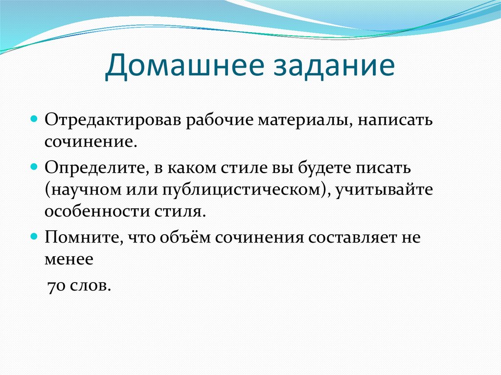 Домашнее заданиеОтредактировав рабочие материалы, написать