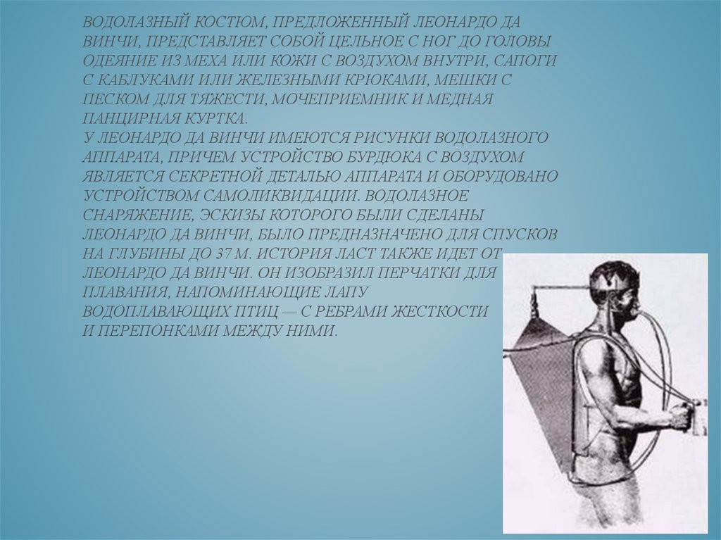 ВОДОЛАЗНЫЙ КОСТЮМ, ПРЕДЛОЖЕННЫЙ ЛЕОНАРДО ДАВИНЧИ, ПРЕДСТАВЛЯЕТ СОБОЙ ЦЕЛЬНОЕ С НОГ ДО ГОЛОВЫ
