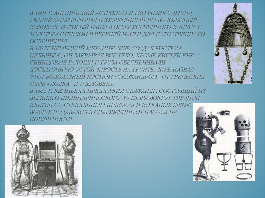 В 1691 Г. АНГЛИЙСКИЙ АСТРОНОМ И ГЕОФИЗИК ЭДМУНДГАЛЛЕЙ ЗАПАТЕНТОВАЛ ИЗОБРЕТЕННЫЙ ИМ ВОДОЛАЗНЫЙ