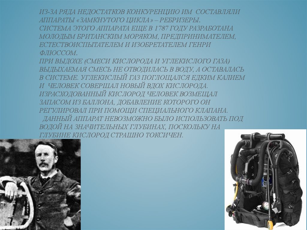 ИЗ-ЗА РЯДА НЕДОСТАТКОВ КОНКУРЕНЦИЮ ИМ СОСТАВЛЯЛИАППАРАТЫ «ЗАМКНУТОГО ЦИКЛА» – РЕБРИЗЕРЫ.