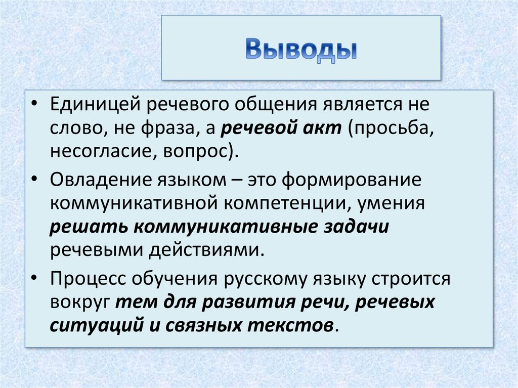 • Единицей речевого общения является неслово, не фраза, а речевой акт (просьба,