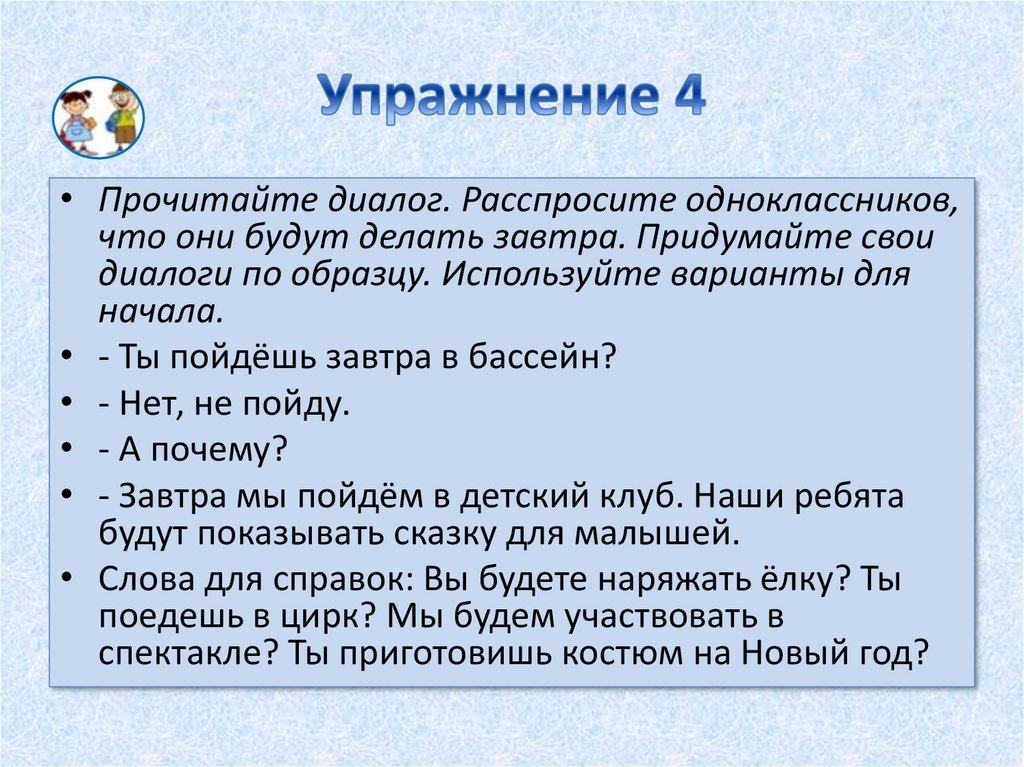 • Прочитайте диалог. Расспросите одноклассников,что они будут делать завтра. Придумайте свои