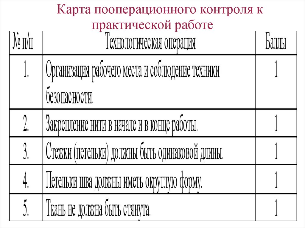 Карта пооперационного контроля кпрактической работе
