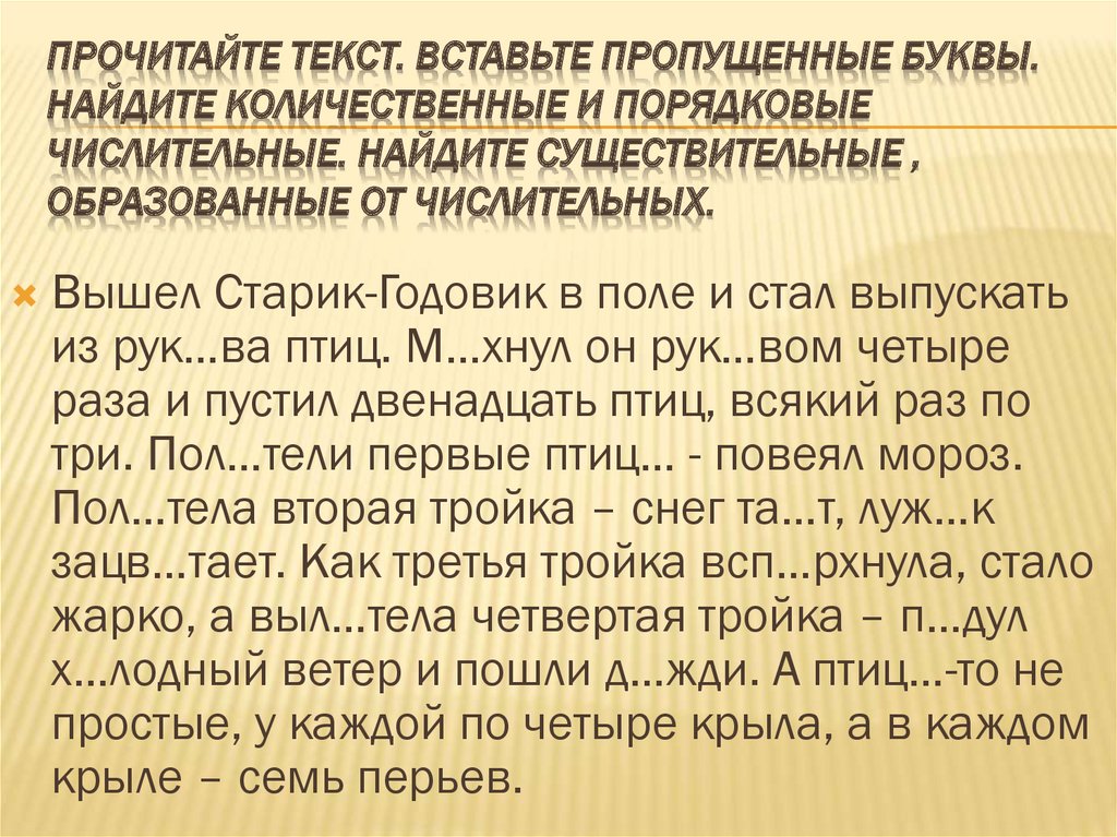 ПРОЧИТАЙТЕ ТЕКСТ. ВСТАВЬТЕ ПРОПУЩЕННЫЕ БУКВЫ.НАЙДИТЕ КОЛИЧЕСТВЕННЫЕ И ПОРЯДКОВЫЕ