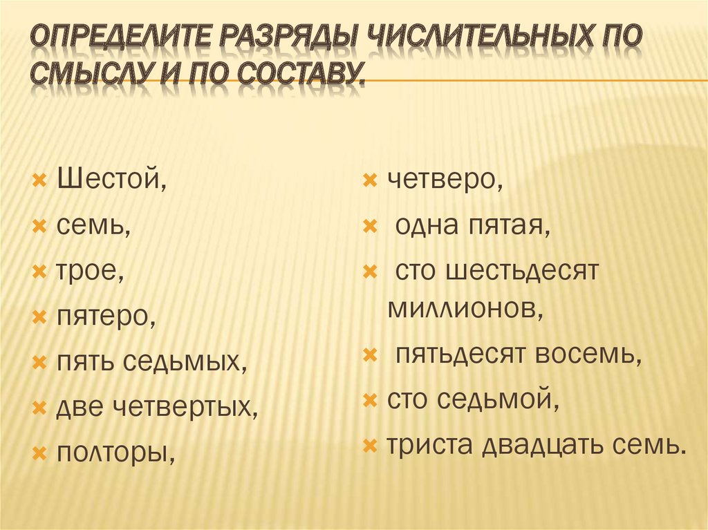 ОПРЕДЕЛИТЕ РАЗРЯДЫ ЧИСЛИТЕЛЬНЫХ ПОСМЫСЛУ И ПО СОСТАВУ.