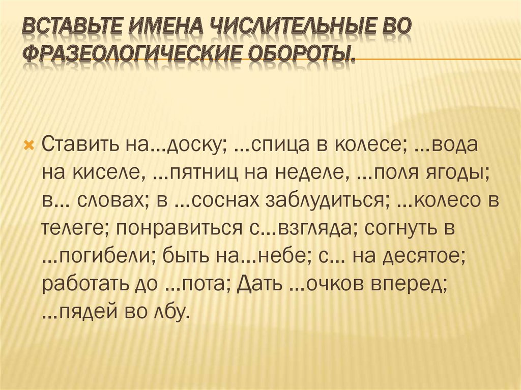 ВСТАВЬТЕ ИМЕНА ЧИСЛИТЕЛЬНЫЕ ВОФРАЗЕОЛОГИЧЕСКИЕ ОБОРОТЫ.