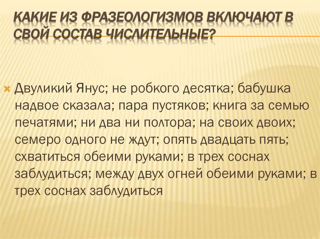 КАКИЕ ИЗ ФРАЗЕОЛОГИЗМОВ ВКЛЮЧАЮТ ВСВОЙ СОСТАВ ЧИСЛИТЕЛЬНЫЕ?