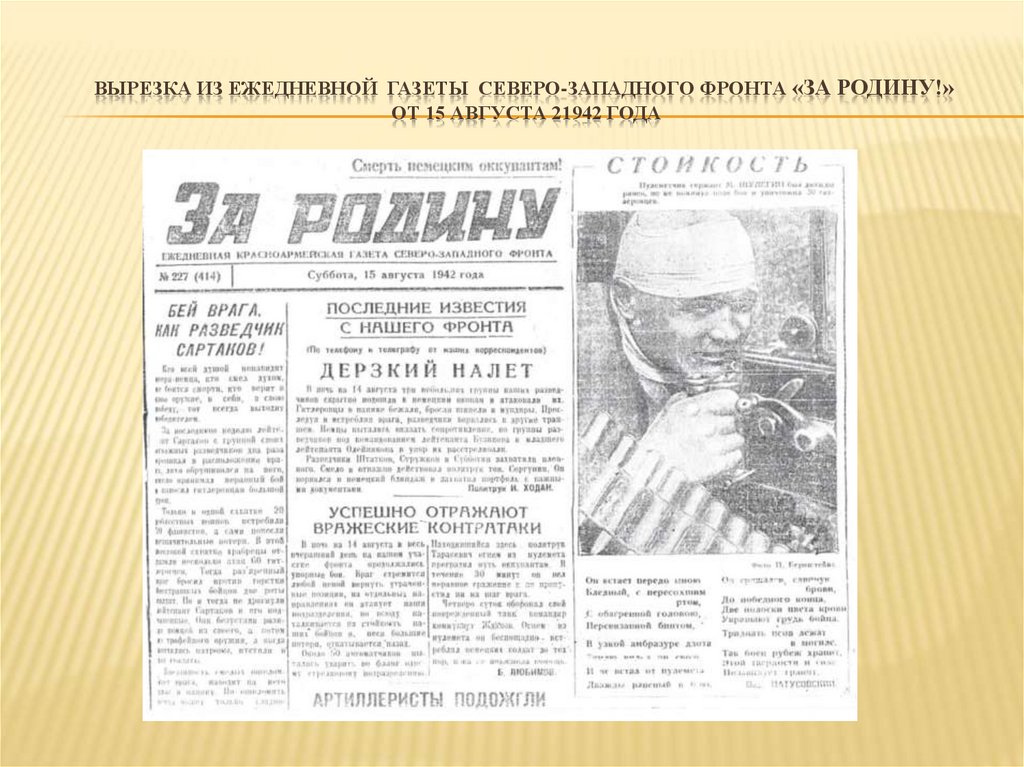 ВЫРЕЗКА ИЗ ЕЖЕДНЕВНОЙ ГАЗЕТЫ СЕВЕРО-ЗАПАДНОГО ФРОНТА «ЗА РОДИНУ!»ОТ 15 АВГУСТА 21942 ГОДА