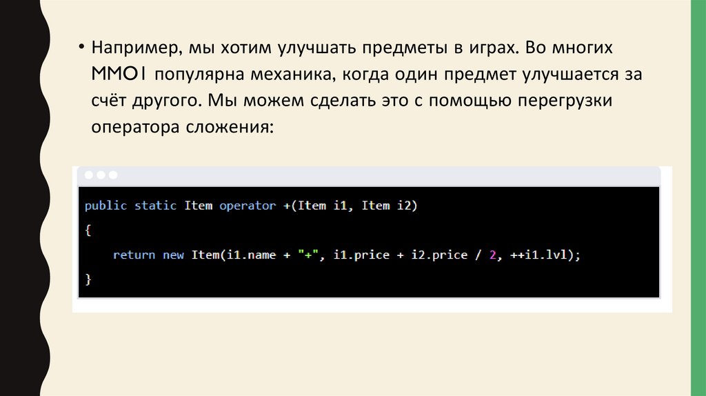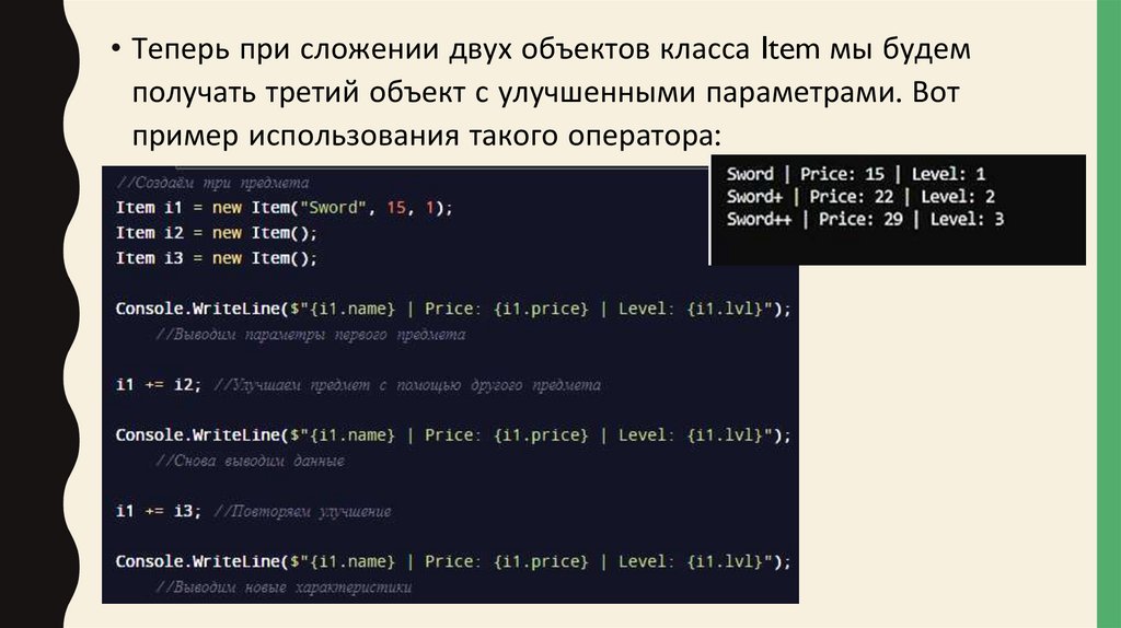 • Теперь при сложении двух объектов класса Item мы будемполучать третий объект с улучшенными параметрами. Вот