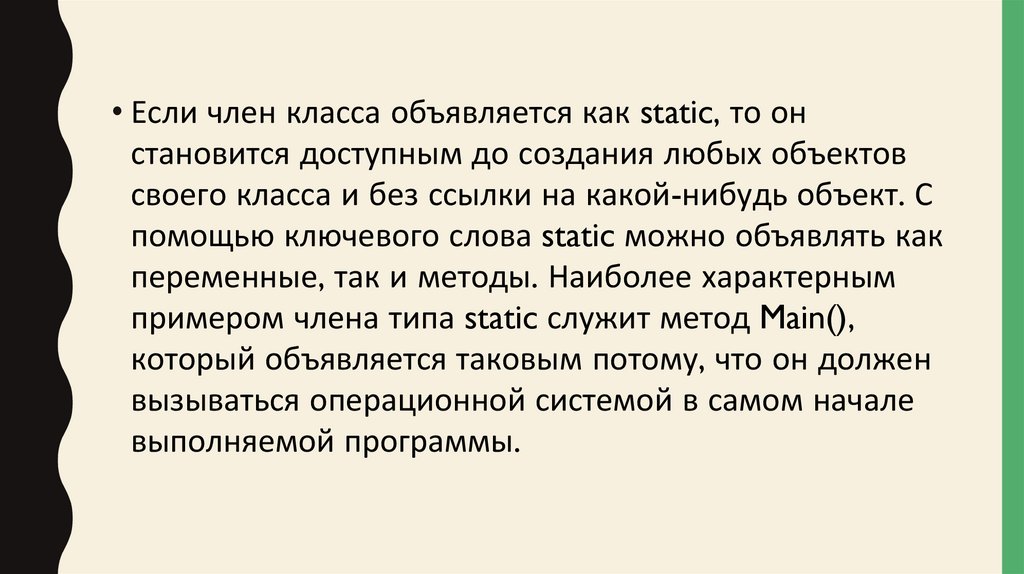 • Если член класса объявляется как static, то онстановится доступным до создания любых объектов