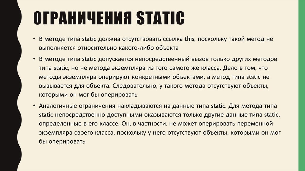 ОГРАНИЧЕНИЯ STATIC• В методе типа static должна отсутствовать ссылка this, поскольку такой метод не