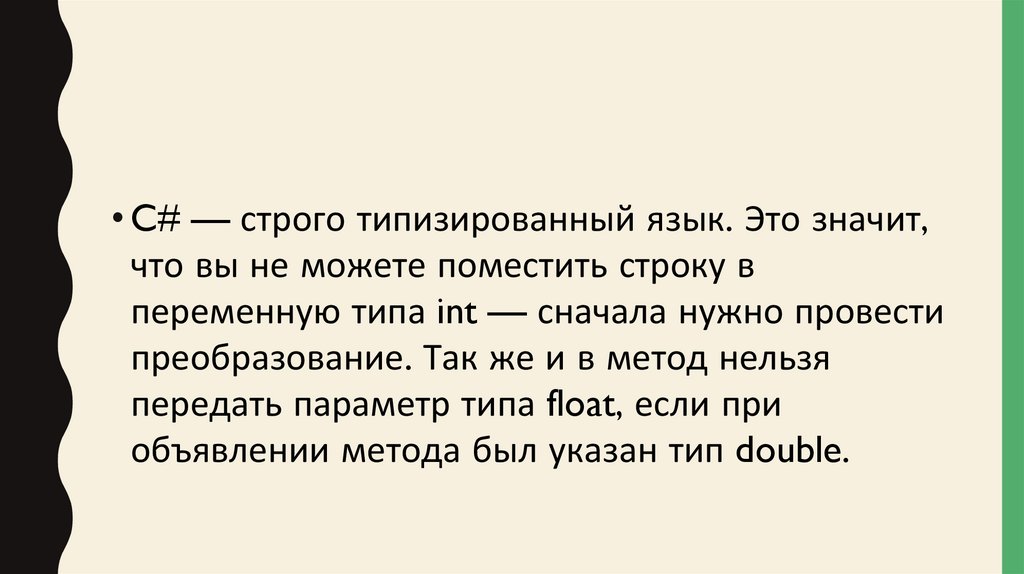 • C# — строго типизированный язык. Это значит,что вы не можете поместить строку в