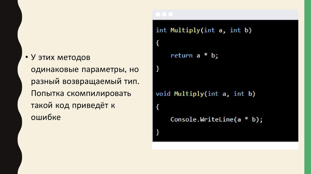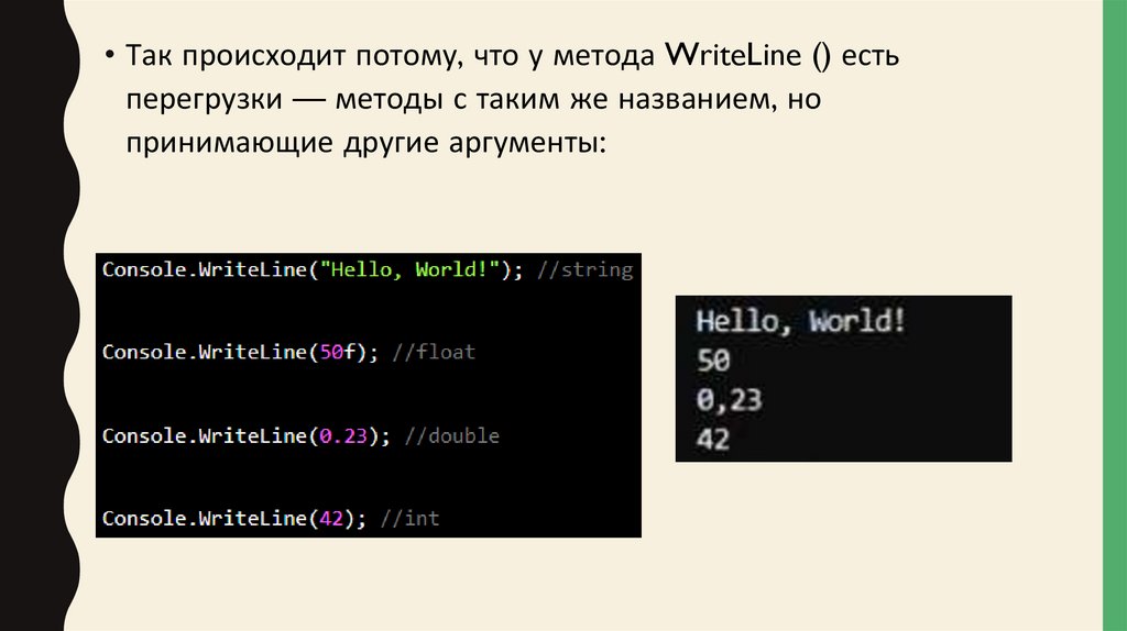 • Так происходит потому, что у метода WriteLine () естьперегрузки — методы с таким же названием, но
