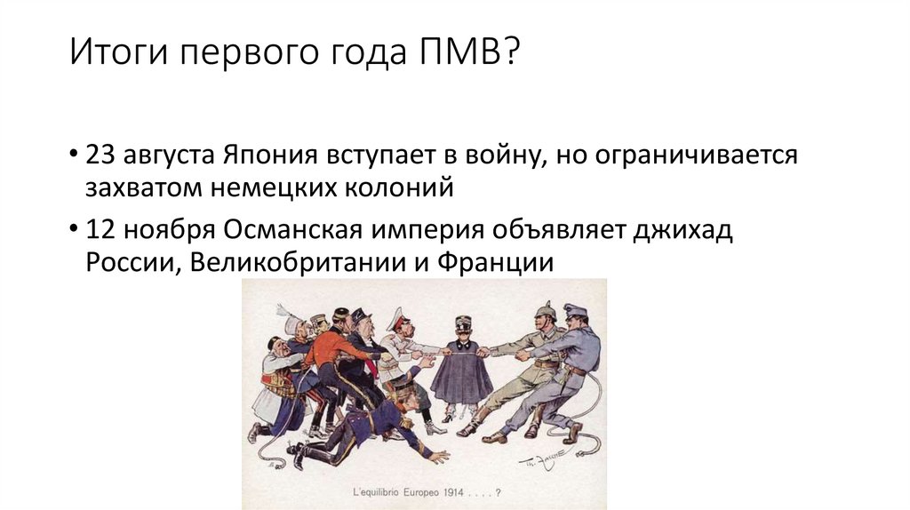 Итоги первого года ПМВ?• 23 августа Япония вступает в войну, но ограничивается