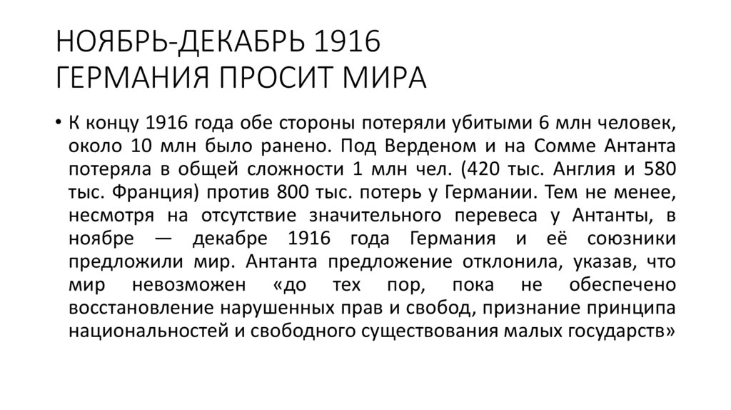 НОЯБРЬ-ДЕКАБРЬ 1916ГЕРМАНИЯ ПРОСИТ МИРА